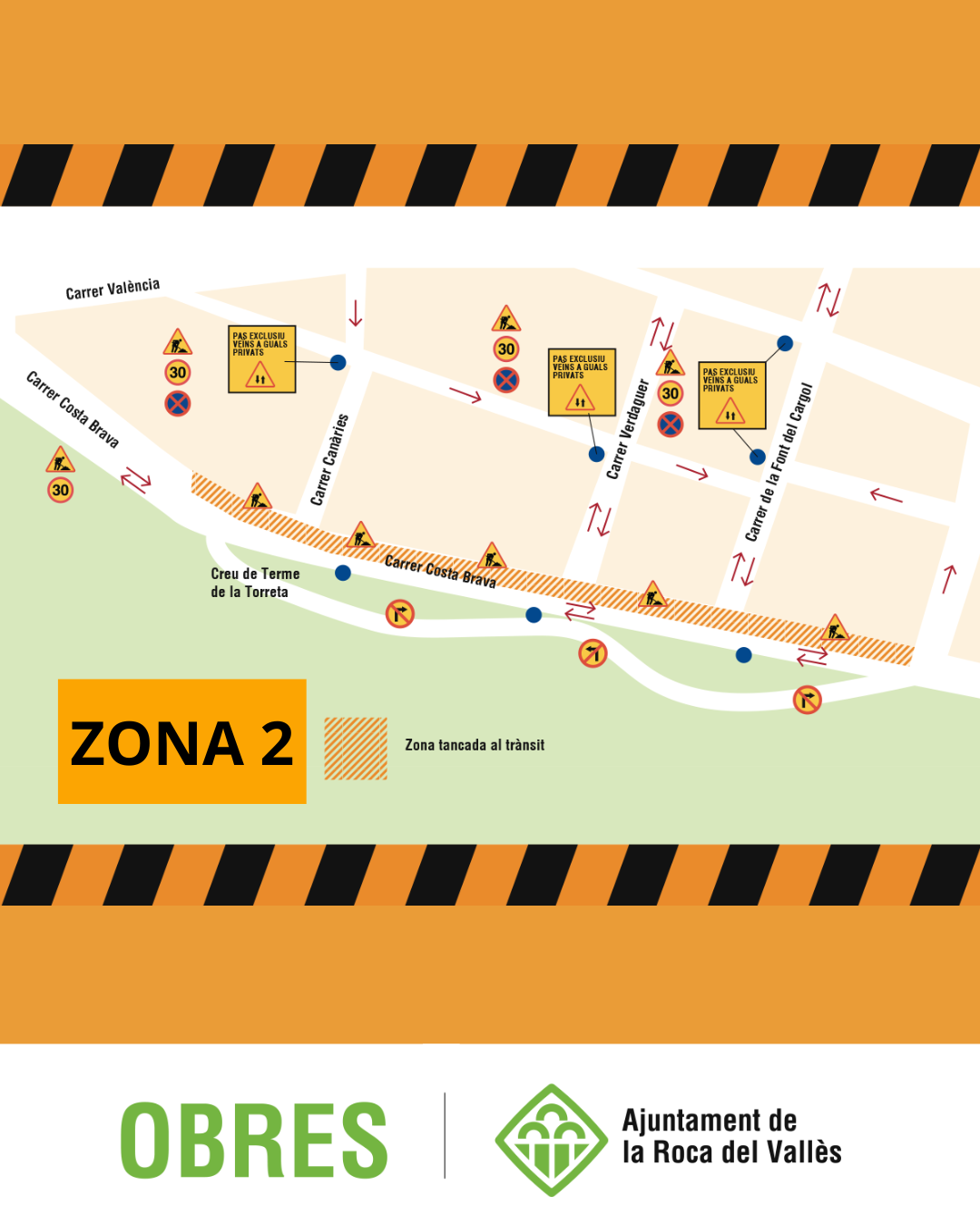 Amb l’inici dels treballs, s’ha dut a terme la corresponent senyalització i ha quedat prohibit l’estacionament tant al mateix carrer Costa Brava com a la zona d’aparcament en semi-bateria situada al seu inici. En aquest moment, s’estan executant de manera simultània les zones 1 i 2 de l’actuació.