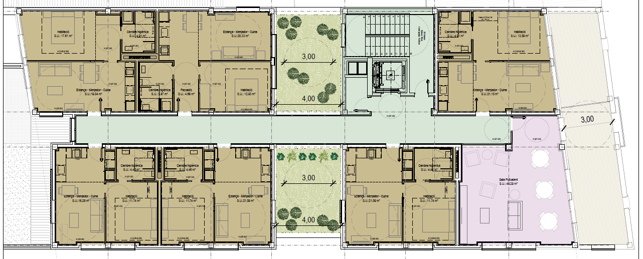 L’equipament s’ha dissenyat amb una clara orientació al confort i la convivència comunitària. A la planta baixa hi haurà el centre de dia, amb espais d’estada, menjador, àrea de fisioteràpia, cuina i jardí exterior. Les plantes superiors acolliran 13 habitatges tutelats, que permetran viure de forma autònoma amb serveis d’acompanyament i zones compartides.