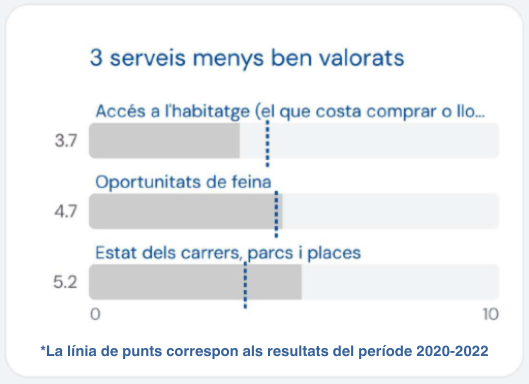 D'altra banda, els serveis municipals pitjor valorats per la ciutadania són, en aquest ordre: l’accés a l'habitatge, amb una nota de 3,7; les oportunitats de feina, que obtenen un 4,7; i l’estat dels carrers, parcs i places, que ha millorat en la seva valoració passant a un 5,2.